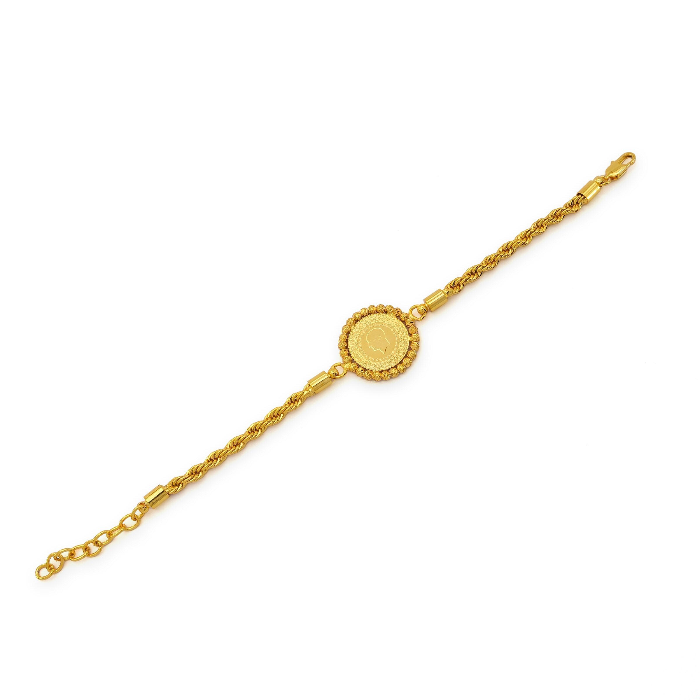 Toptan takı ve kuyumcu vitrinlerinin vazgeçilmezi olan Çerçeve Bileklik modellerimiz, özellikle düğün sezonlarında ve özel günlerde en çok talep gören ürünlerin başında gelir. Altın Kaplama Çeyrekli Dorika Çerçeve Burgu Zincirli Çerçeve Bileklik BLK-1173, içine yerleştirilecek altın (çeyrek/yarım/tam) ile mükemmel uyum sağlayacak şekilde, gerçek altın kalıpları kullanılarak üretilmiştir.