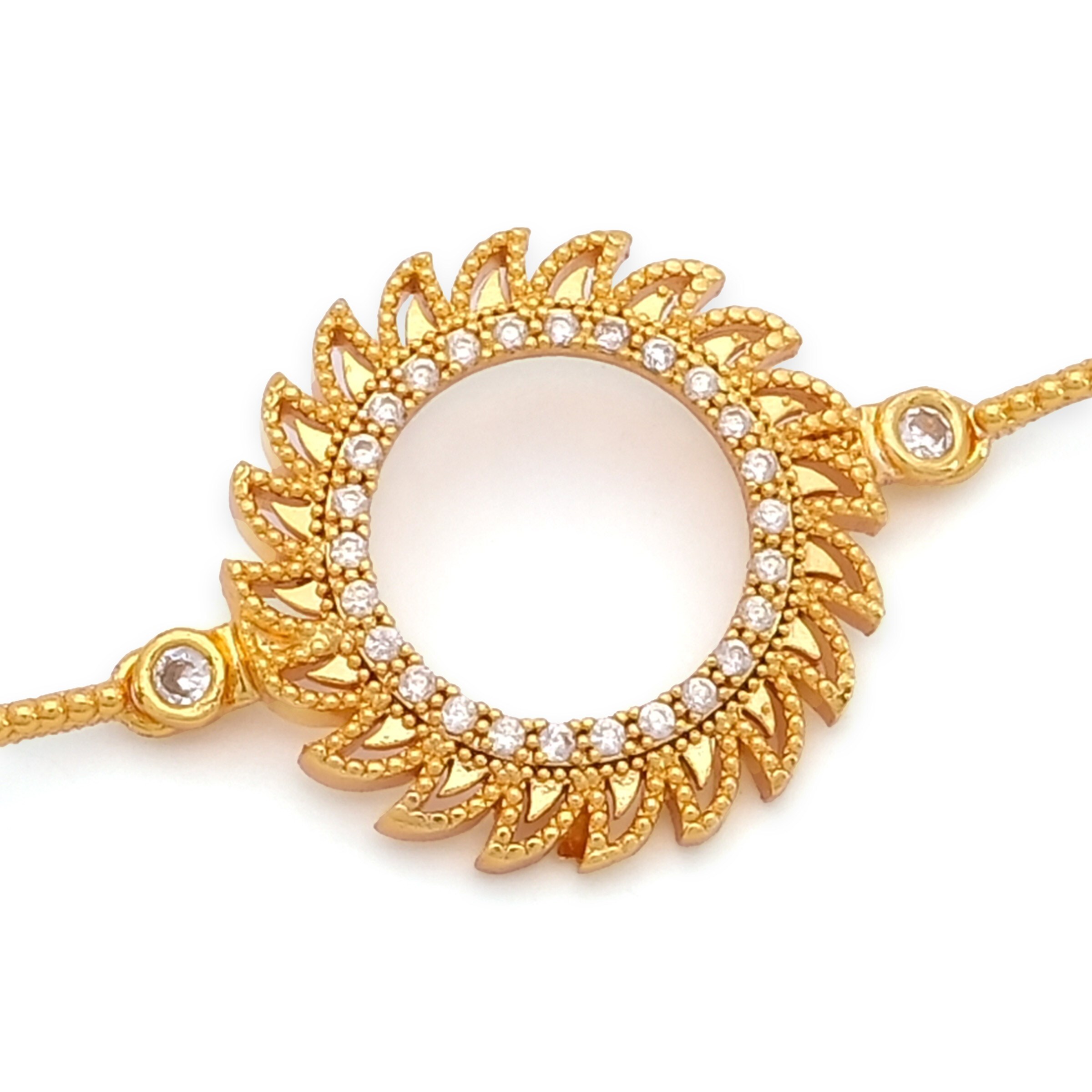 Toptan takı ve kuyumcu vitrinlerinin vazgeçilmezi olan Çerçeve Bileklik modellerimiz, özellikle düğün sezonlarında ve özel günlerde en çok talep gören ürünlerin başında gelir. Altın Kaplama İmitasyon Güneş Model Nazar Boncuklu Çeyrek Çerçeveli Bileklik BLK-1218, içine yerleştirilecek altın (çeyrek/yarım/tam) ile mükemmel uyum sağlayacak şekilde, gerçek altın kalıpları kullanılarak üretilmiştir.