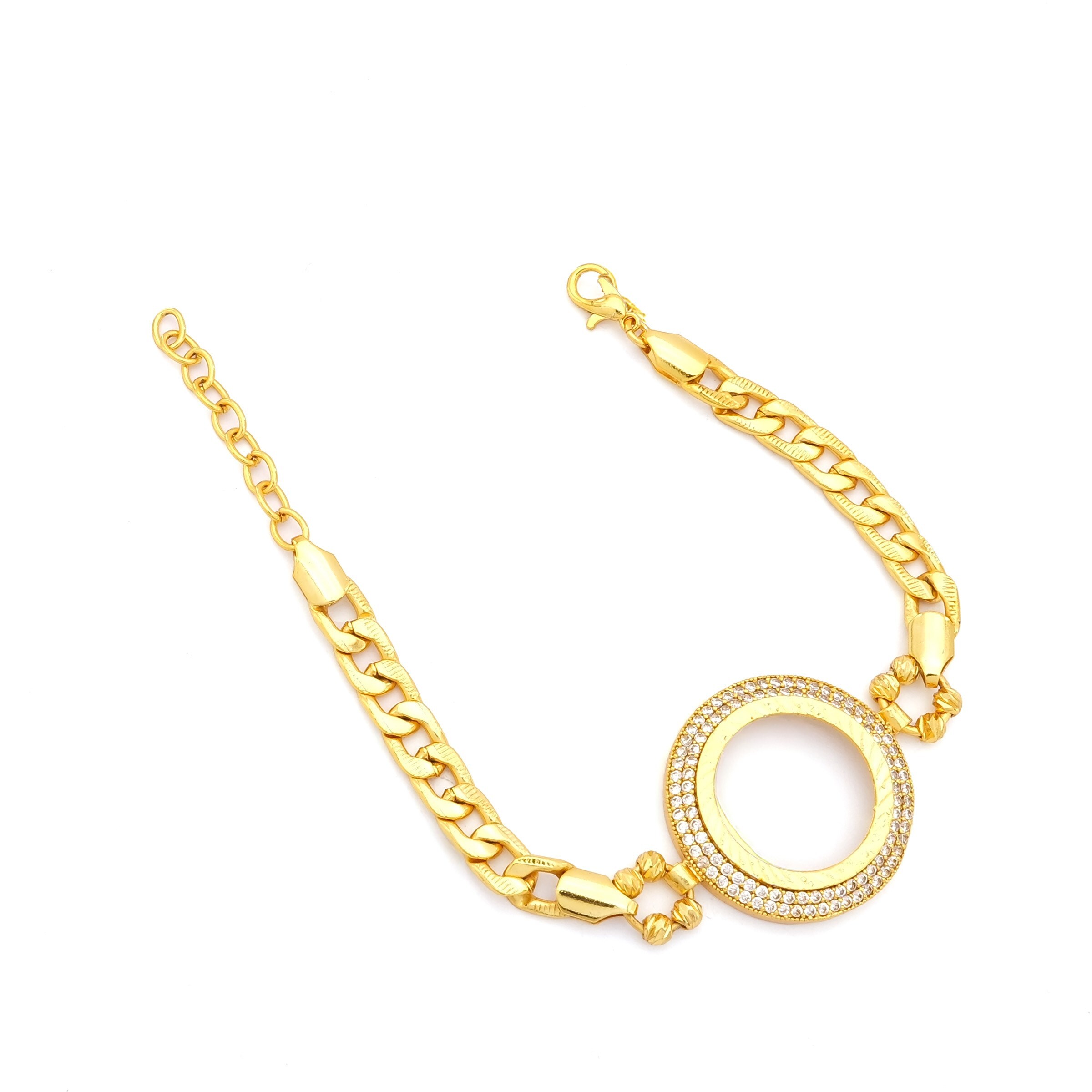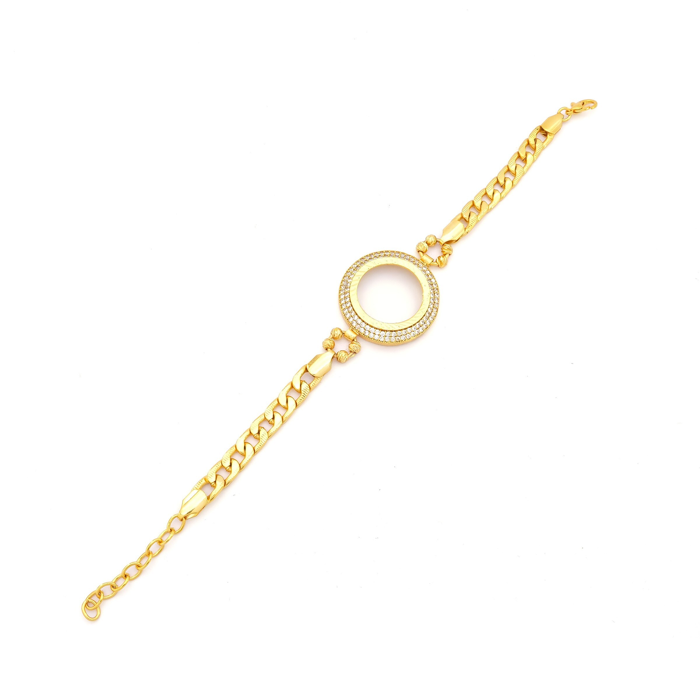 Toptan takı ve kuyumcu vitrinlerinin vazgeçilmezi olan Çerçeve Bileklik modellerimiz, özellikle düğün sezonlarında ve özel günlerde en çok talep gören ürünlerin başında gelir. Altın Kaplama Yarım Çerçeve Bileklik BLK-1128, içine yerleştirilecek altın (çeyrek/yarım/tam) ile mükemmel uyum sağlayacak şekilde, gerçek altın kalıpları kullanılarak üretilmiştir.