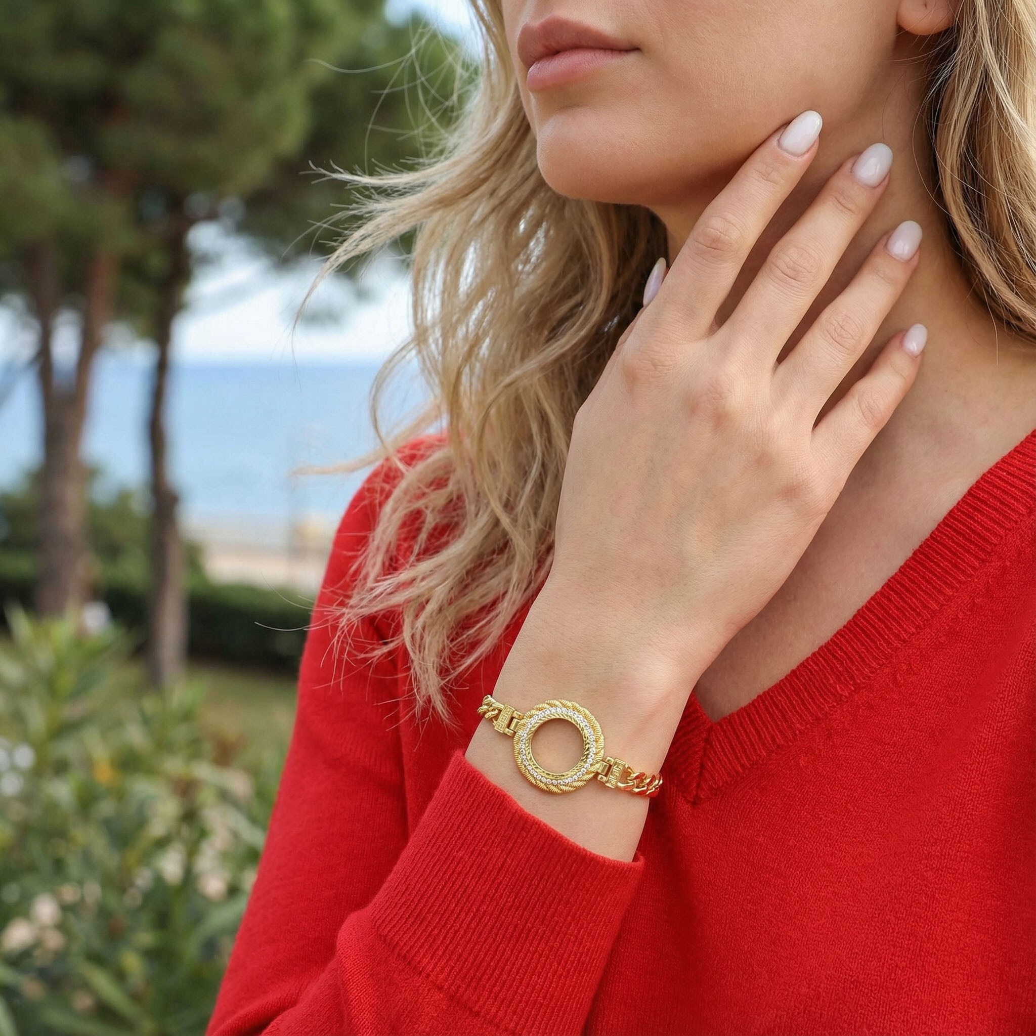 Her bir çerçeve bileklik, kuyumcu ustalığıyla üretilmiştir. Yüksek kaliteli çelik üzerine 2 mikron altın kaplama uygulanarak parlak, pürüzsüz ve uzun ömürlü bir yüzey elde edilir. Gerçek altına yakın görünümü sayesinde hem zarif hem de dikkat çekici bir duruş sunar.