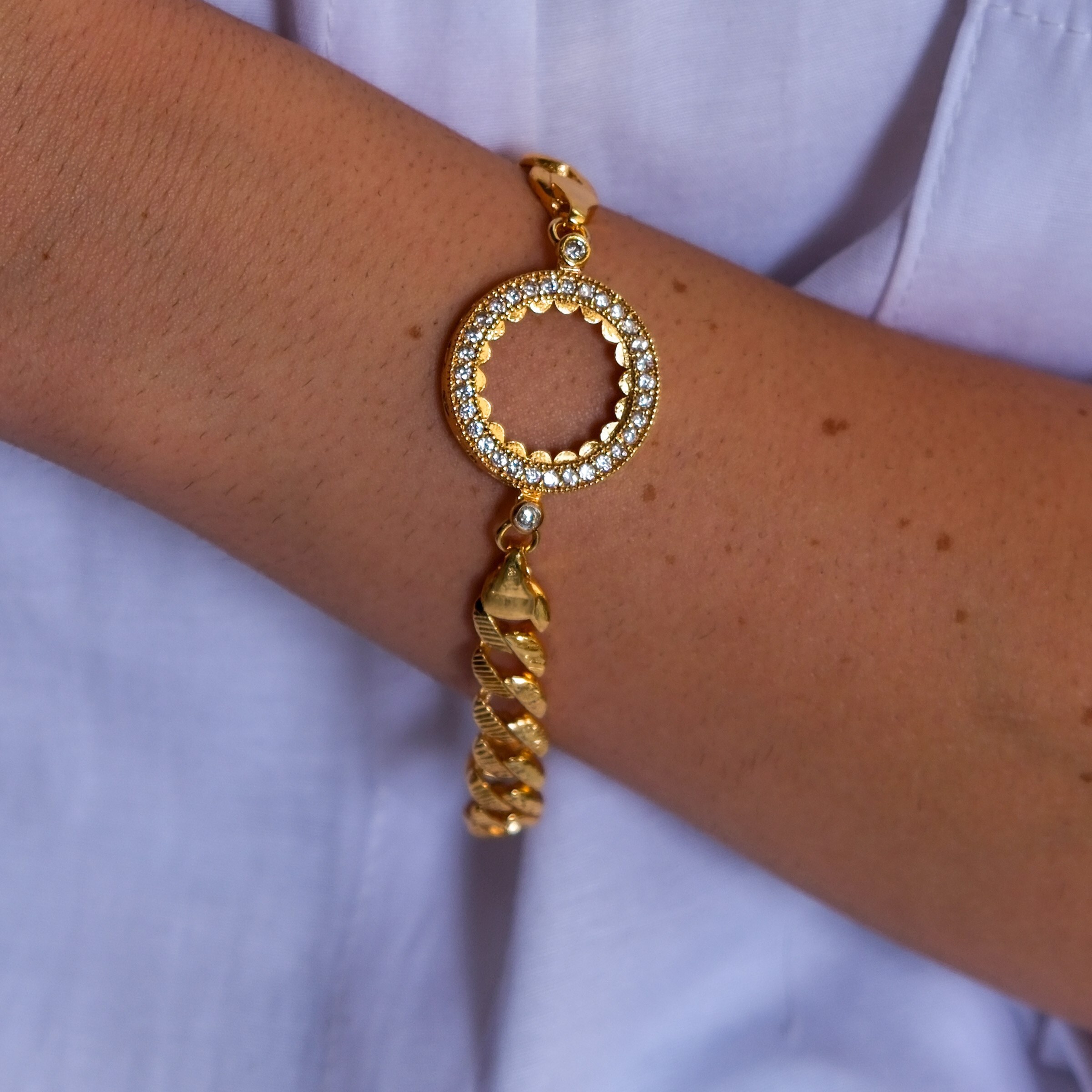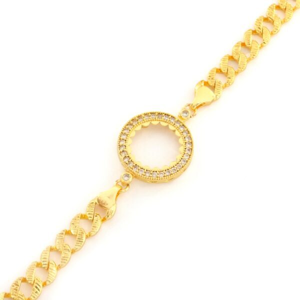 Toptan takı ve kuyumcu vitrinlerinin vazgeçilmezi olan Çerçeve Bileklik modellerimiz, özellikle düğün sezonlarında ve özel günlerde en çok talep gören ürünlerin başında gelir. Çeyrek Altın Çerçeve Bileklik Çelik Altın Kaplama Figaro Model BLK-1078, içine yerleştirilecek altın (çeyrek/yarım/tam) ile mükemmel uyum sağlayacak şekilde, gerçek altın kalıpları kullanılarak üretilmiştir.
