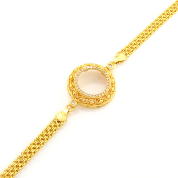 Toptan takı ve kuyumcu vitrinlerinin vazgeçilmezi olan Çerçeve Bileklik modellerimiz, özellikle düğün sezonlarında ve özel günlerde en çok talep gören ürünlerin başında gelir. Çeyrek Altın Çerçeve Bileklik Çelik Altın Kaplama İşlemeli BLK-1096, içine yerleştirilecek altın (çeyrek/yarım/tam) ile mükemmel uyum sağlayacak şekilde, gerçek altın kalıpları kullanılarak üretilmiştir.