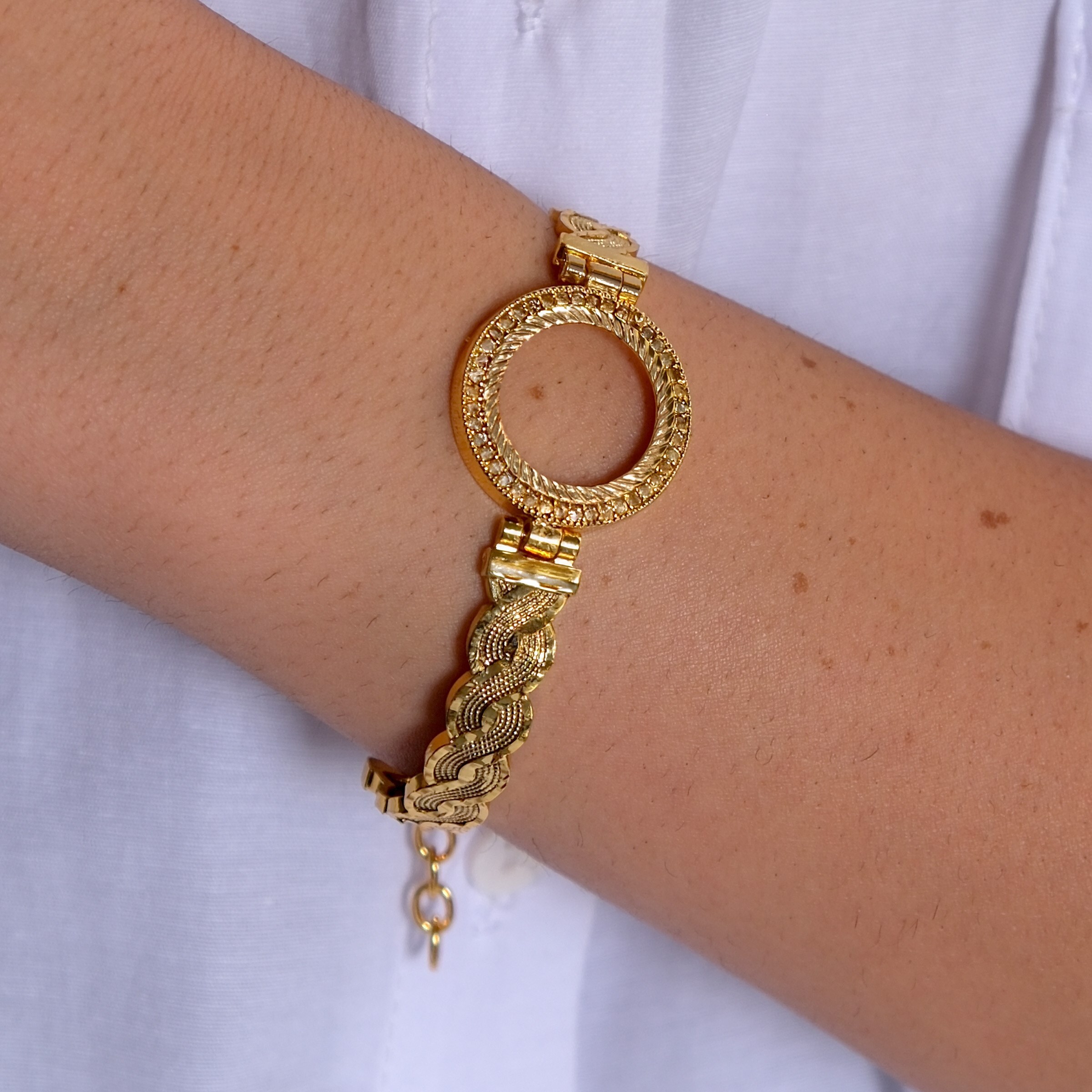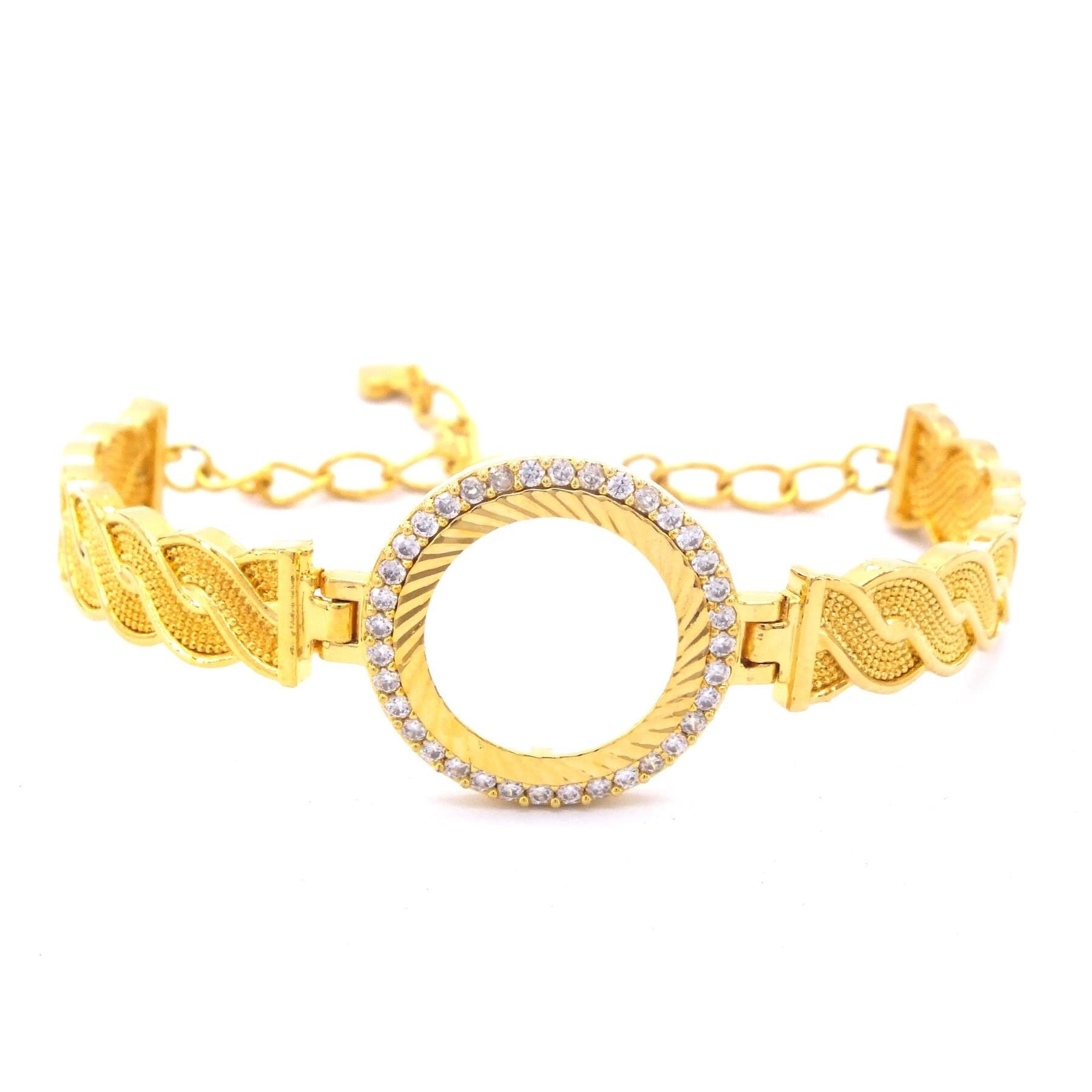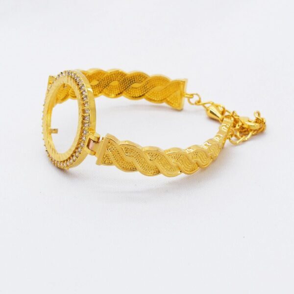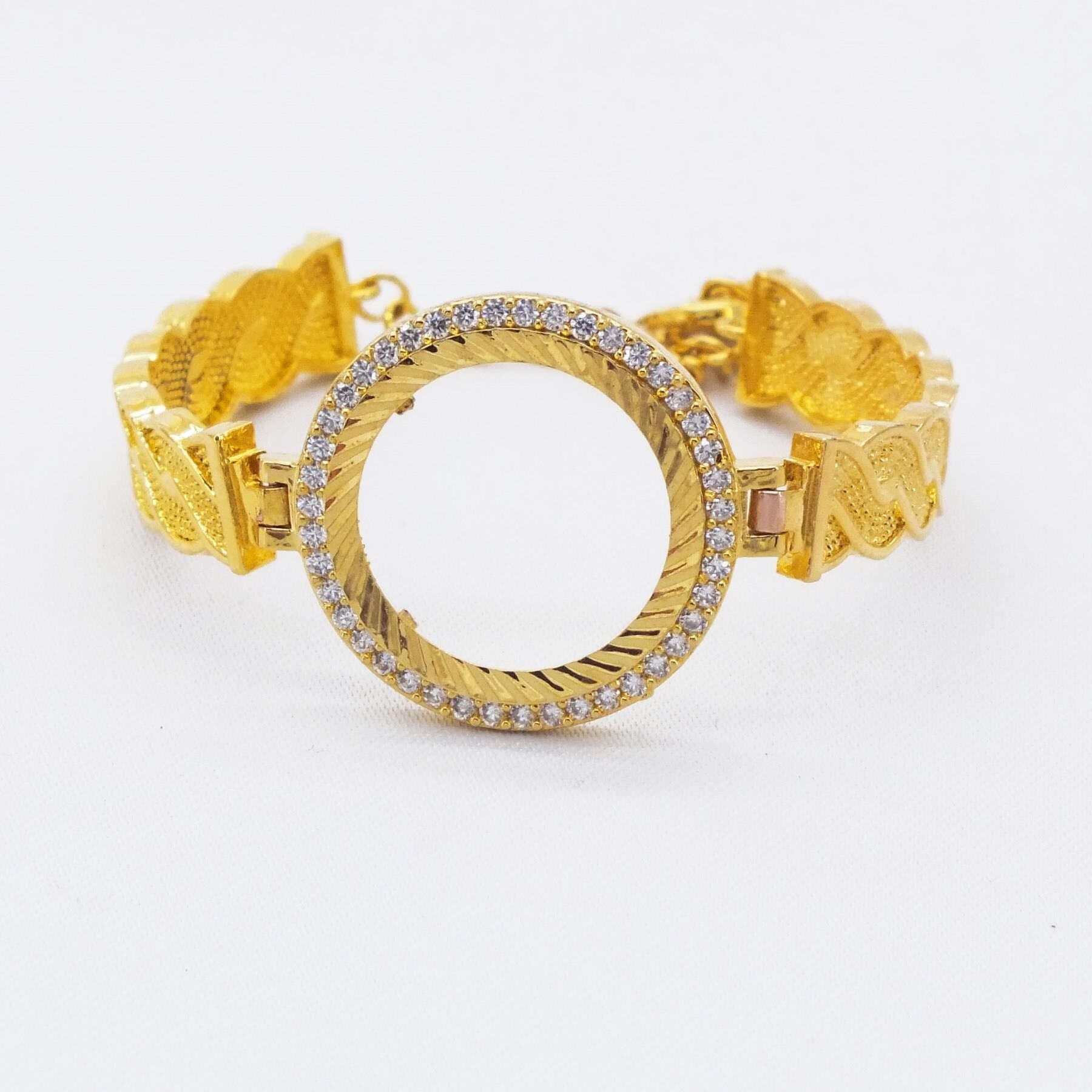 Toptan takı ve kuyumcu vitrinlerinin vazgeçilmezi olan Çerçeve Bileklik modellerimiz, özellikle düğün sezonlarında ve özel günlerde en çok talep gören ürünlerin başında gelir. Çeyrekli Çerçeve Bileklik Altın Kaplama Zirkon Taşlı Kelepçe BLZ-126, içine yerleştirilecek altın (çeyrek/yarım/tam) ile mükemmel uyum sağlayacak şekilde, gerçek altın kalıpları kullanılarak üretilmiştir.