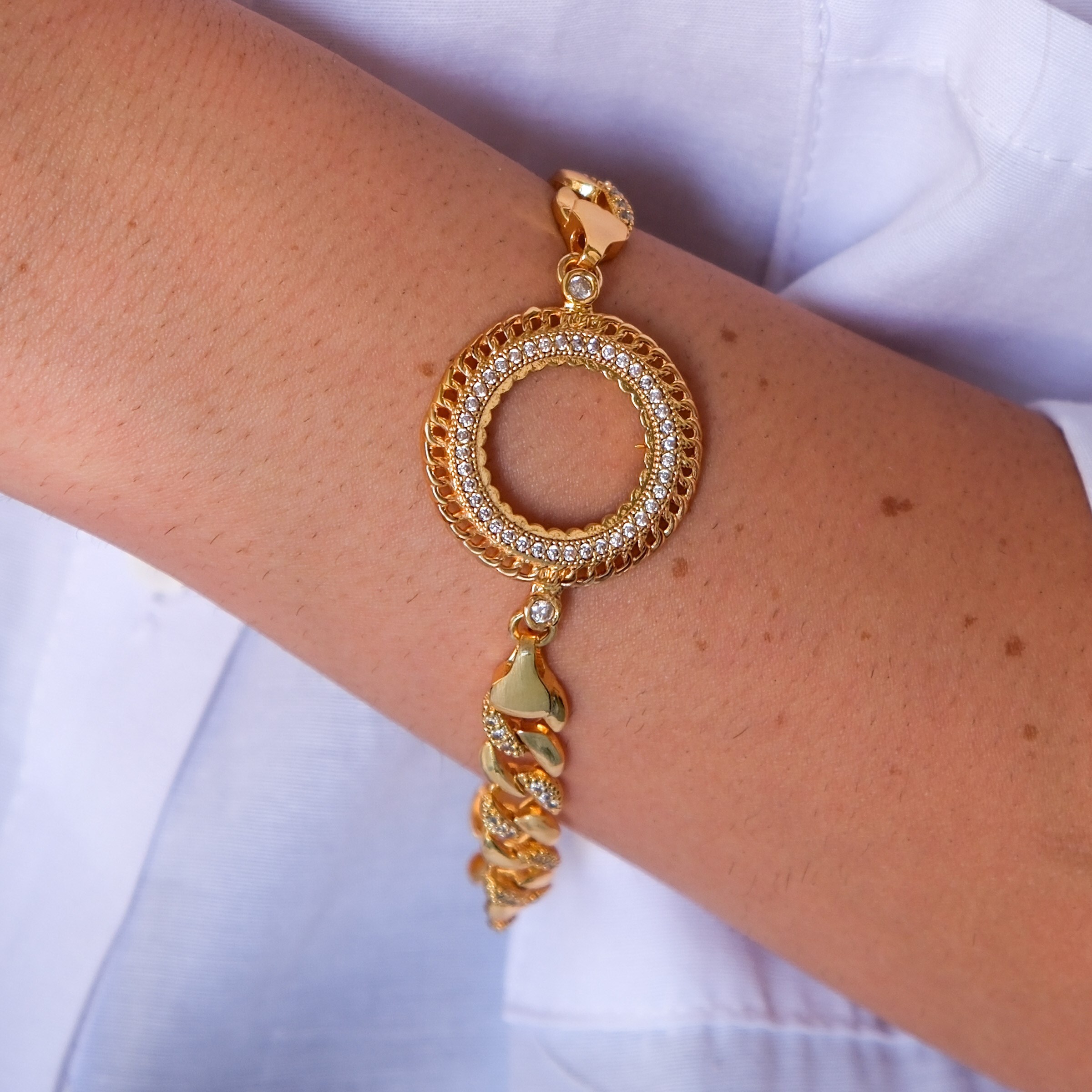 Yarım Altın Çerçeve Bileklik Çelik Altın Kaplama Figaro Model BLK-1115, estetik tasarımı ve zarif detayları ile ön plana çıkan özel bir aksesuardır. Geleneksel çeyrek altın görünümünü, modern tasarımla birleştirerek şıklığınıza değer katar. Hem günlük kullanım hem de özel günler için ideal bir tamamlayıcıdır.