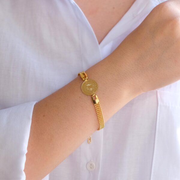 Altın kaplama çeyrekli bileklikler, ustalar tarafından kuyumcu işçiliğiyle üretilmiştir. Yüksek kaliteli çelik üzerine 2 mikron altın kaplama uygulanarak gerçek altın görünümü elde edilir. Parlak yüzeyi ve zarif işçiliğiyle uzun ömürlü kullanım sağlar.