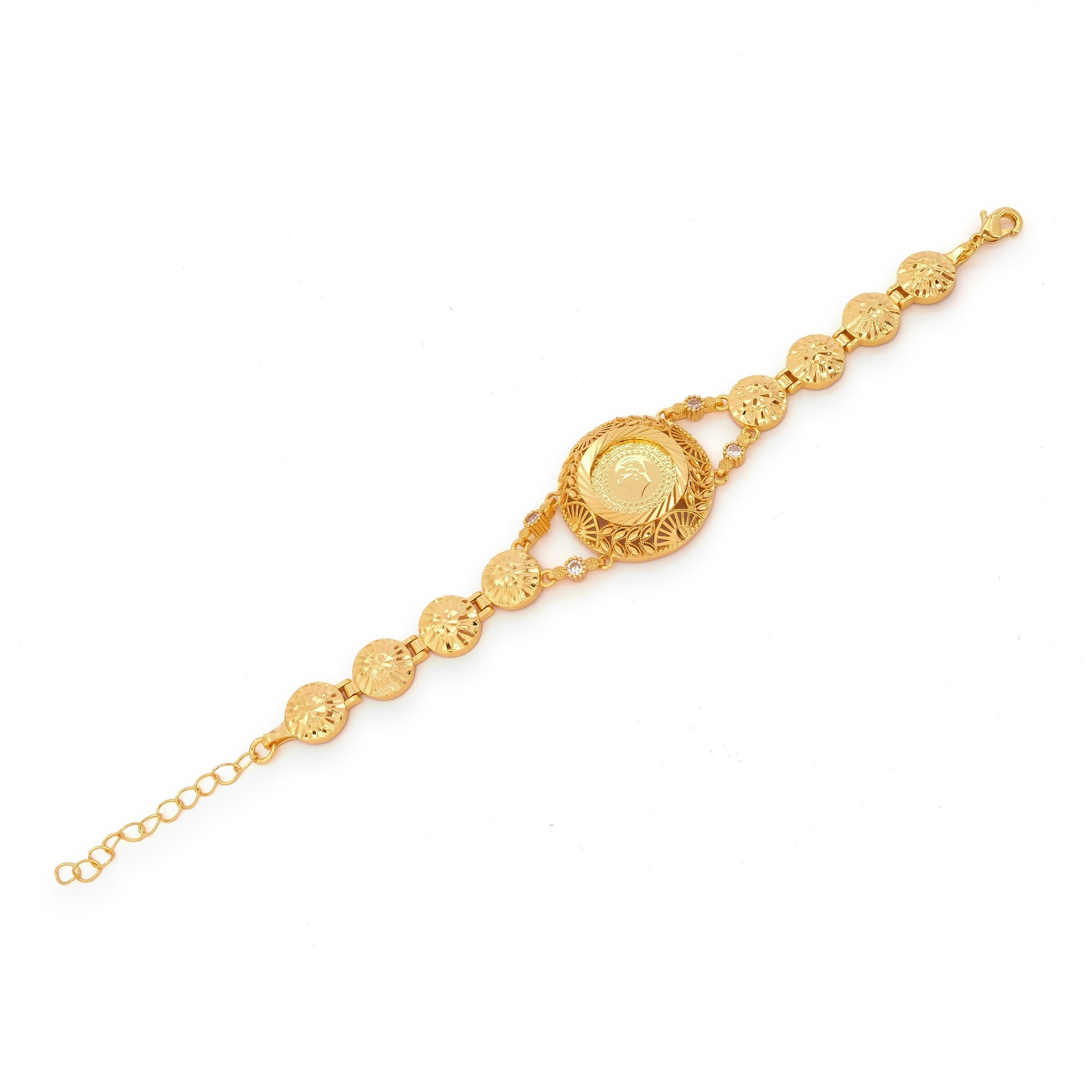 Altın kaplama çeyrekli bileklikler, ustalar tarafından kuyumcu işçiliğiyle üretilmiştir. Yüksek kaliteli çelik üzerine 2 mikron altın kaplama uygulanarak gerçek altın görünümü elde edilir. Parlak yüzeyi ve zarif işçiliğiyle uzun ömürlü kullanım sağlar.