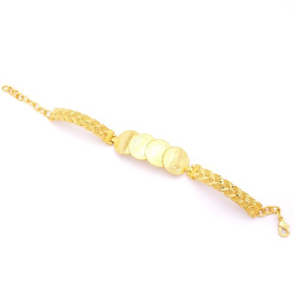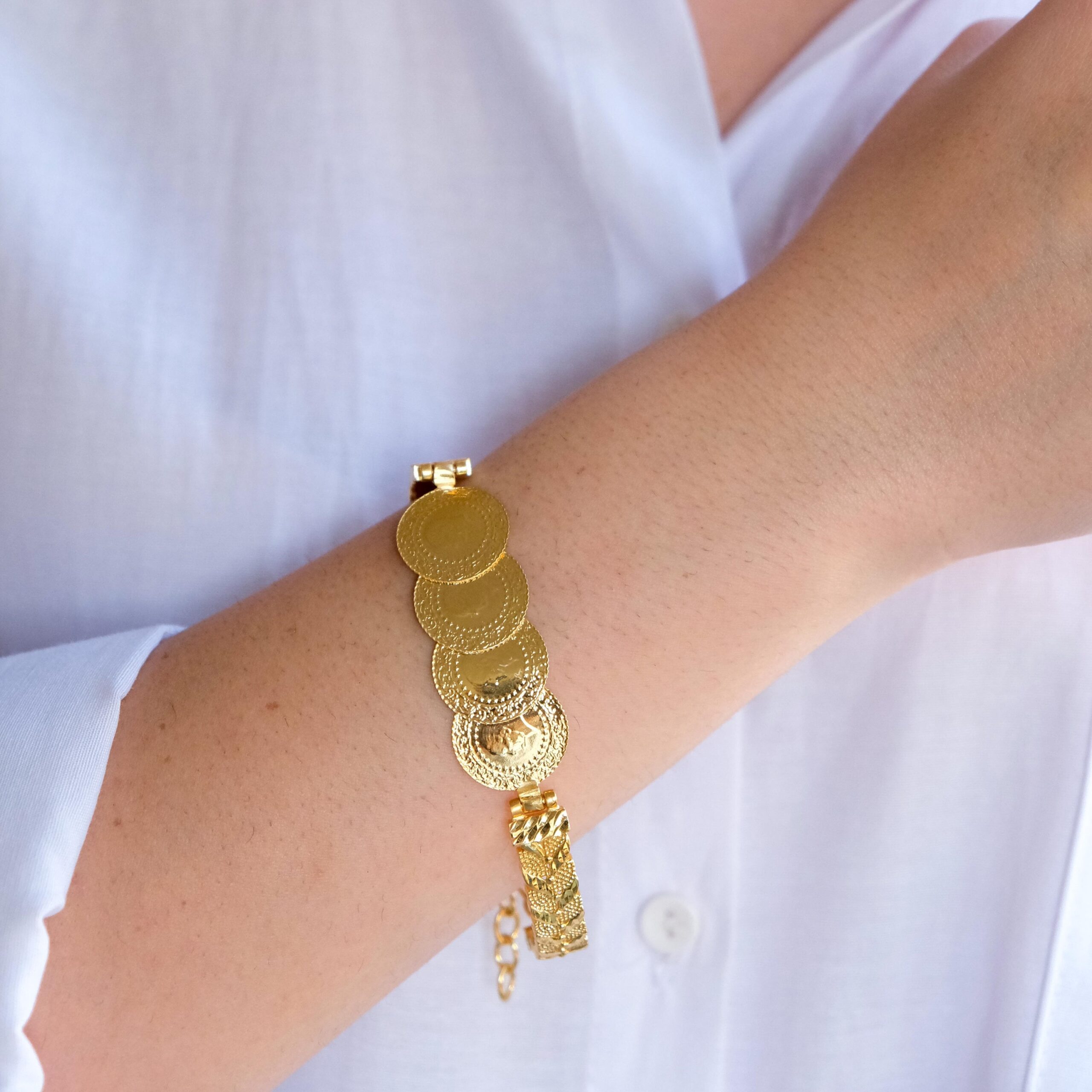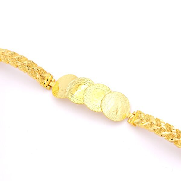 Altın kaplama çeyrekli bileklikler, ustalar tarafından kuyumcu işçiliğiyle üretilmiştir. Yüksek kaliteli çelik üzerine 2 mikron altın kaplama uygulanarak gerçek altın görünümü elde edilir. Parlak yüzeyi ve zarif işçiliğiyle uzun ömürlü kullanım sağlar.