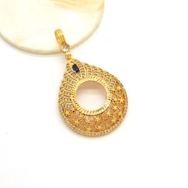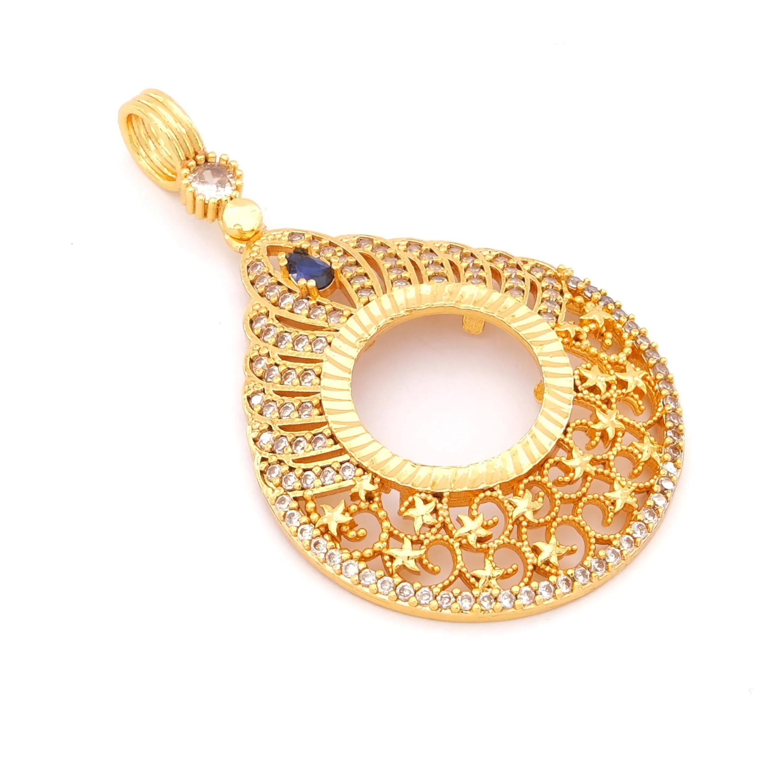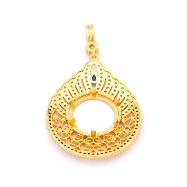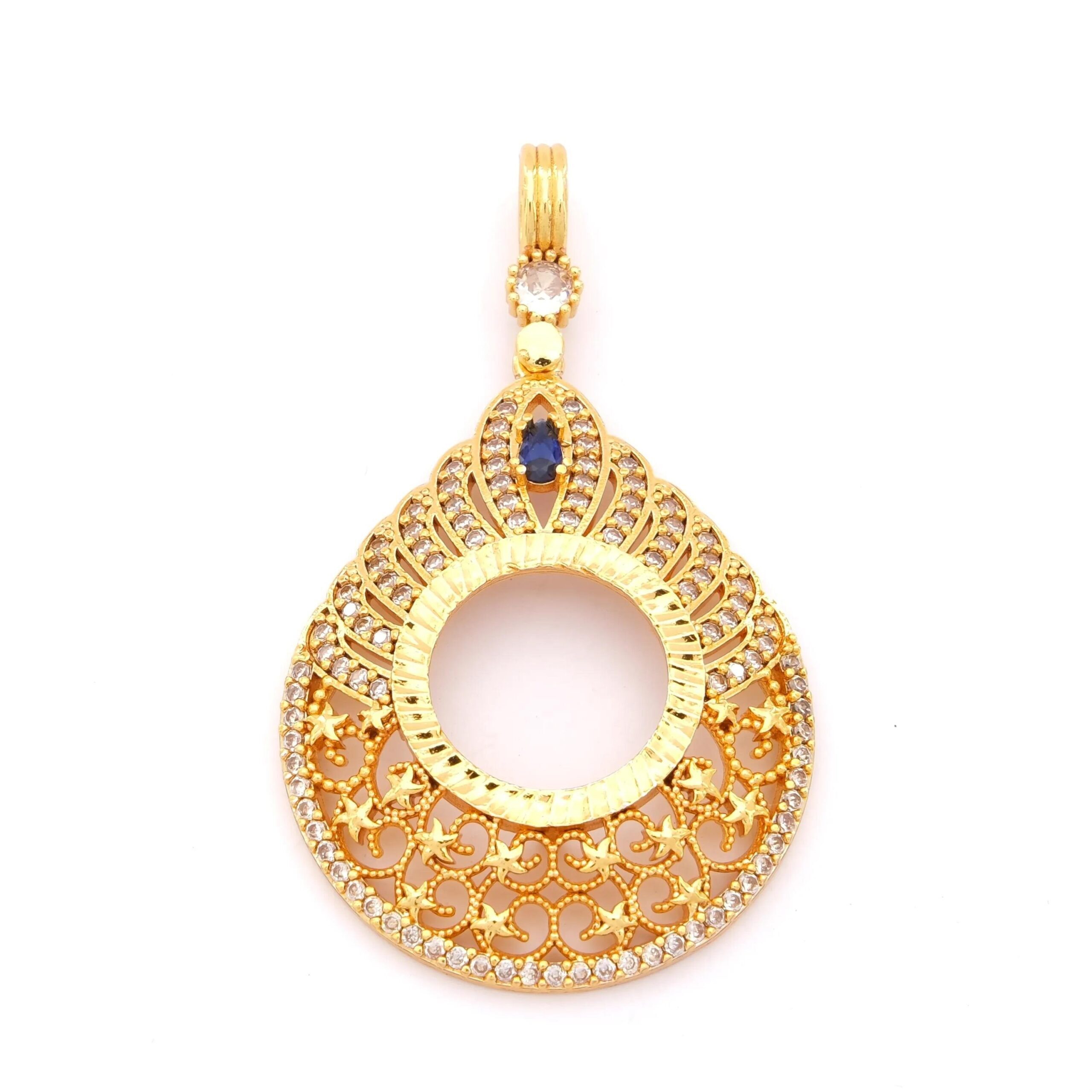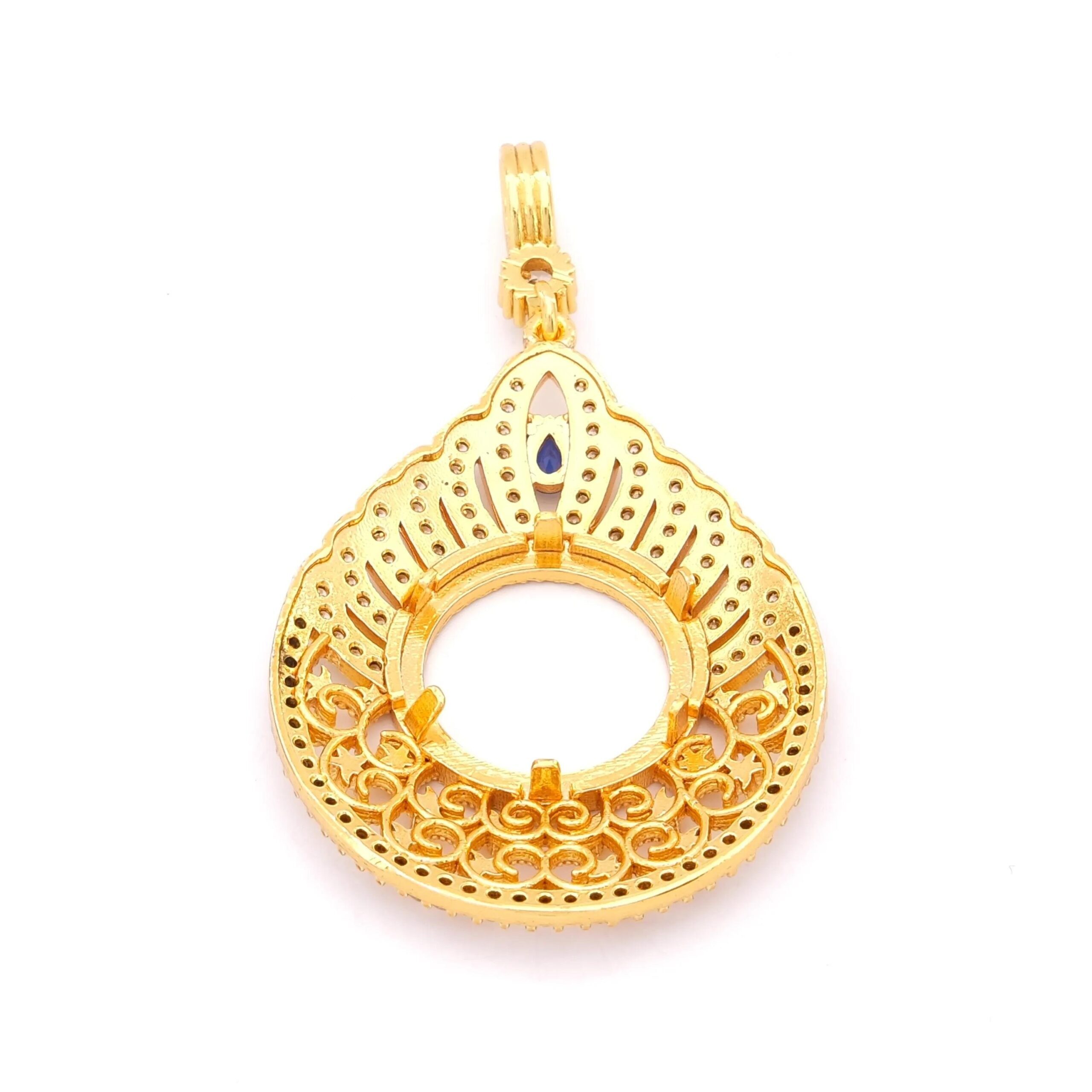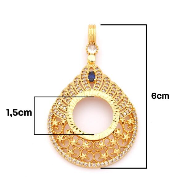 Çeyrek Altın Çerçeveli Kolye Ucu Altın Kaplama TGR-691, zarif mavi taş detayı, dantel işlemeleri ve estetik tasarımıyla her kombininize zarafet katar. Bu özel tasarımı hemen sipariş ederek FerizZ kalitesini keşfedin ve tarzınıza şıklık katın!